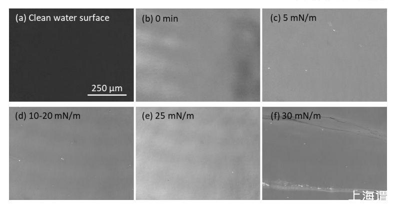 圖3、空氣-水界面處的FhuA膜BAM(布呂斯特角顯微鏡)圖。(a)在MPD緩沖液中擴(kuò)散FhuA WT之前和(b)之后的Langmuir槽氣-水界面BAM圖像;和(c-f)在不同表面壓力下的屏障壓縮。涂敷后立即在空氣-水界面上吸附一層致密均勻的FhuA WT膜。FhuA WT膜可以被壓縮到高達(dá)25 mN/m的表面壓力,而不會表現(xiàn)出不均勻性。在表面壓力為30 mN/m時(shí),在FhuA WT薄膜中可以看到垂直于壓縮方向的細(xì)長裂紋。