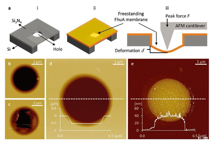 圖4、在FhuA單層膜上的AFM測量.a)當(dāng)(i)未覆蓋和(ii)覆蓋有FhuA膜時(shí)在其中心具有單個(gè)孔的氮化硅膜窗口的示意圖.(iii)在PeakForce QNM模式下AFM成像期間FhuA膜涂覆的氮化硅膜窗口的橫截面(b-d)當(dāng)(b)孔未被FhuA膜覆蓋,(c)孔被破裂的FhuAΔCVF膜覆蓋時(shí),氮化硅膜窗口中的孔的AFM高度圖像膜,和(d)孔被一個(gè)完整的FhuAΔCVFtev膜層覆蓋(d)和(e)中的高度和變形圖像是同時(shí)獲得的,并且所有圖像都是在水中測量的。(d)和(e)中的高度和變形曲線分別屬于圖像中的虛線。