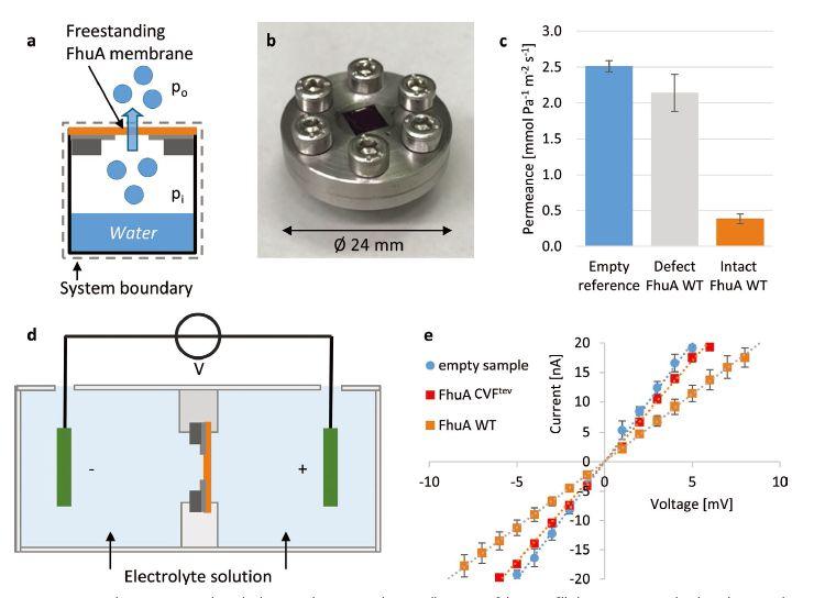 圖5、通過FhuA膜的水和離子滲透。a)覆蓋有氮化硅膜窗口的充水容器的示意圖,其用于測量FhuA WT膜的水滲透。由從杯內(nèi)到杯外的水蒸氣壓差驅(qū)動(pi-p0)(a)中所示的杯子的照片。c)FhuA WT膜的水滲透性為3.87×104 mol Pa-1 m?2 s-1(空參考25.13×104 mol Pa-1 m?2 s-1誤差條表示至少三個(gè)樣品的平均值的標(biāo)準(zhǔn)誤差。d)用于測量FhuA膜的離子滲透性的實(shí)驗(yàn)裝置的示意圖。離子在電極之間擴(kuò)散的唯一方式是滲透氮化硅膜窗口中的孔頂部的FhuA膜。e)在磷酸鹽緩沖液(10×10?3 m NaCl,10×10?3 m恒定斜率對應(yīng)于4.0mS(空參比)、3.4mS(FhuA?CVF)、3.4mS(FhuA?CVF)和3.4mS(FhuA?CVF)的電極之間的恒定電導(dǎo).