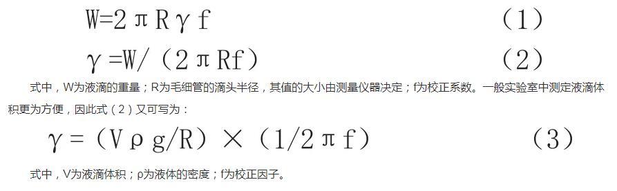 滴體積法的基本原理是這樣的,利用毛細管滴頭,緩慢往下滴液體,這時候測量液滴的大小,就能測定液體的表面張力。這是因為液體的表面張力,與從毛細管滴下的液滴的大小有內(nèi)在關(guān)聯(lián),存在正比關(guān)系,這個關(guān)系可以用數(shù)學公式表達: