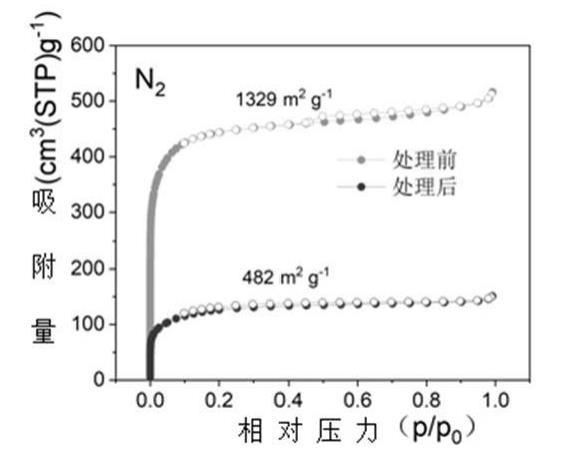 步驟1所用活性碳纖維以及本實(shí)施例制備得到的高能量轉(zhuǎn)化效率的碳材料的氮?dú)馕摳綔y(cè)試可以看出:制備前活性碳纖維的氮?dú)馕摳綔y(cè)出比表面積為1329m2/g,經(jīng)過處理,比表面積降至482m2/g,說明蒽在孔內(nèi)的沉積改變了孔的結(jié)構(gòu),減小了孔容,孔腹尺寸被收縮;