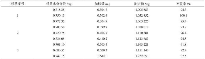 在樣品中加入精密稱(chēng)取的標(biāo)準(zhǔn)水加標(biāo)水平分別為0.3 mg、0.4 mg、0.5 mg,在150℃加熱10 min的測(cè)定條件下,采用滴定度為1 mg/mL的費(fèi)休氏試劑,每個(gè)加標(biāo)水平重復(fù)測(cè)定3次,經(jīng)測(cè)定,加標(biāo)回收率在91.8%~100.1%,結(jié)果見(jiàn)表6。