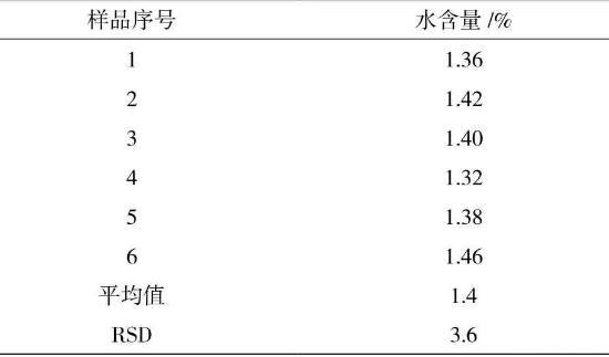 在150℃加熱10 min的測(cè)定條件下,采用滴定度為1 mg/mL的費(fèi)休氏試劑,用卡氏干燥爐自動(dòng)進(jìn)樣法測(cè)定樣品中水分含量,樣品測(cè)定6次,計(jì)算6次結(jié)果的相對(duì)標(biāo)準(zhǔn)偏差(RSD%)數(shù)據(jù)見(jiàn)表5。結(jié)果表明測(cè)定結(jié)果具有良好的重復(fù)性。