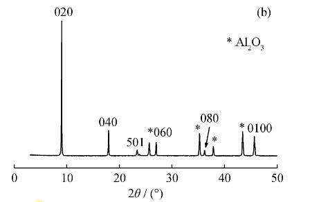 獲得高度b-軸取向的晶種層,是采用二次生長法制備b-軸取向的ZSM-5分子篩膜的關鍵。圖1為以LB法在α-Al2O3載體表面組裝的Silicalite-1型分子篩晶種層SEM照片和其XRD譜。由圖1(a)可見,合成的Silicalite-1分子篩晶粒呈苯環狀,粒徑分布均勻,大小約為1μm,且表面幾乎沒有孿晶生成。使用LB技術在α-Al2O3載體上組裝的單層Silicalite-1晶種層,連續致密。由圖1(b)可知,在5°~50°衍射范圍,除去α-Al2O3載體的特征峰,在9.02°(020)、17.94°(040)、26.98(060)、36.22°(080)和45.68°(0100)處均出現了高強度b-軸取向(0k0)晶面特征衍射峰,計算得到的晶體優先取向值KCPO(0k0)=0.93。因此,采用LB法制備的Silicalite-1晶粒層高度致密且呈b-軸取向。
