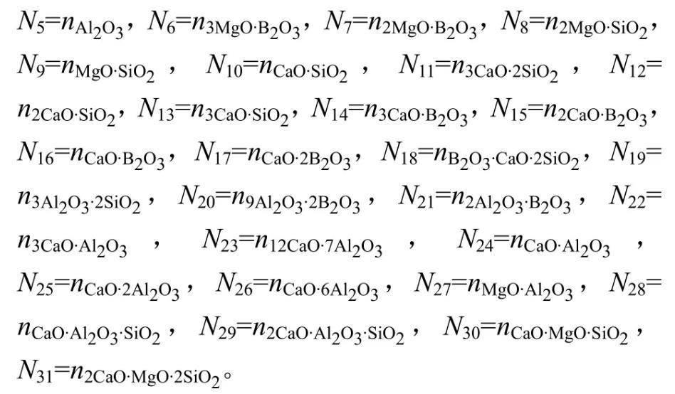 根據(jù)共存理論以及上述確定的MgO-B2O3-SiO2-CaO-Al2O3富硼渣體系熔渣中存在的結(jié)構(gòu)單元,定義熔渣中成分分別為。結(jié)構(gòu)組元作用濃度符號表示為: