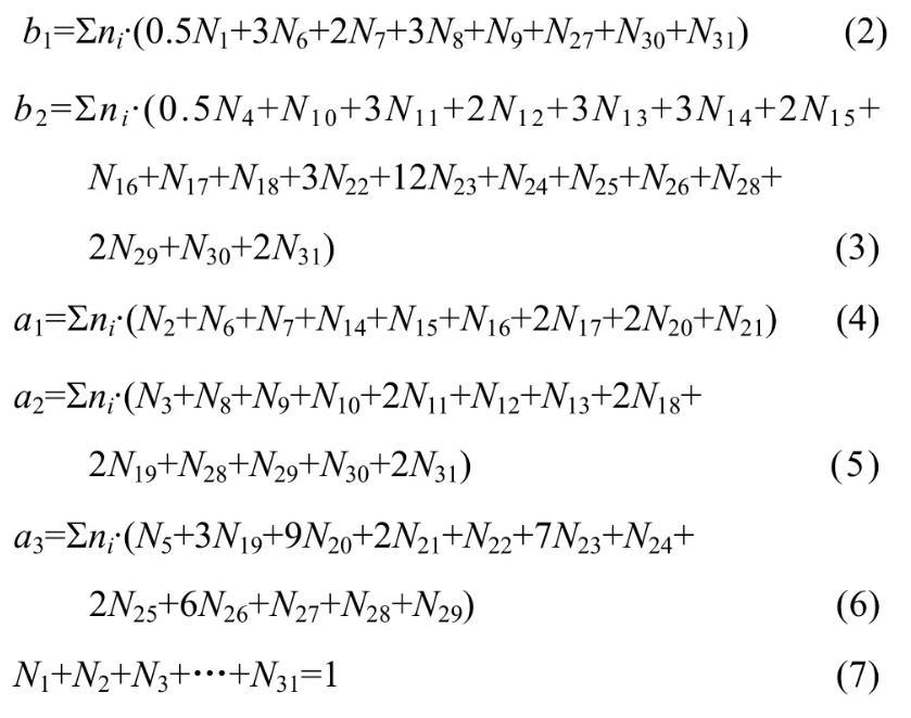 所有組元總平衡摩爾數(shù)表示為∑ni。各組元作用濃度表達(dá)式為: