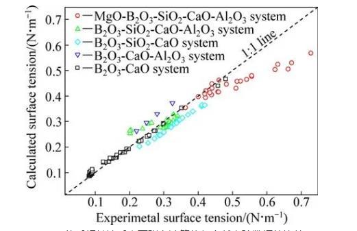 圖1 MgO-B2O3-SiO2-CaO-Al2O3體系相關(guān)渣系表面張力計算值與文獻(xiàn)實(shí)驗(yàn)數(shù)據(jù)的比較