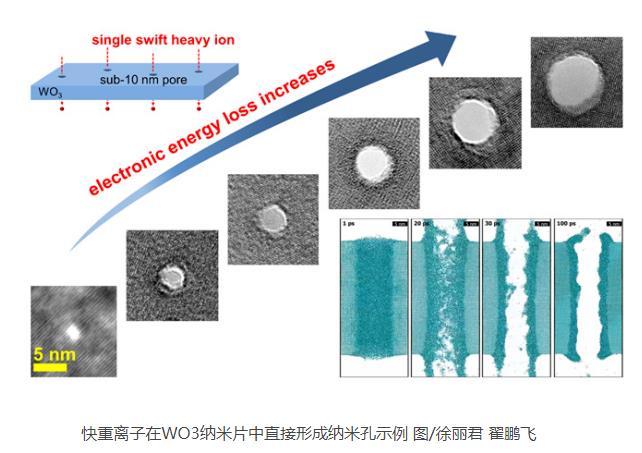 科研人員基于蘭州重離子研究裝置(HIRFL),利用快重離子作用于WO3納米片材料,實(shí)現(xiàn)了直接“打孔”的制備方法。同時(shí),科研人員利用分子動(dòng)力學(xué)模擬對(duì)物理機(jī)理進(jìn)行解釋,發(fā)現(xiàn)重離子在材料中的沉積能量會(huì)引起材料局域瞬時(shí)熔融噴發(fā),以及熔融相的粘度和表面張力大小是決定納米孔形成的關(guān)鍵因素。