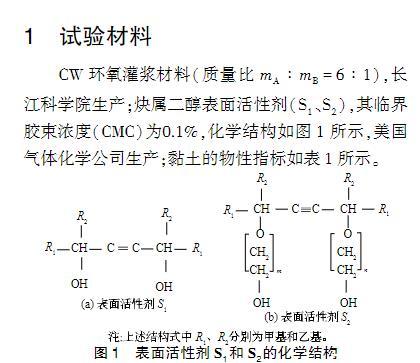 對于環氧樹脂灌漿材料,加入表面活性劑對漿液的黏度、表面張力、接觸角、固化物的力學性能及對被灌體的滲透性有何影響?目前這方面的的研究少見報道。而這些研究對環氧灌漿材料的開發以及灌漿施工都具有非常重要的意義。本文以長江科學院CW環氧灌漿材料為改性對象,加入非離子表面活性劑炔屬二醇對其改性,研究表面活性劑對環氧漿液的黏度、表面張力、接觸角、滲透性和漿液固結體力學性能的影響,在此基礎上探討了表面活性劑降低漿液表面張力、接觸角以及提高漿液滲透性的機理。