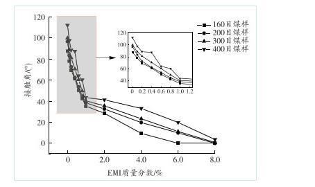 由圖5可知,針對160目測試煤樣,溶液中EMI質(zhì)量分?jǐn)?shù)大于2.0%后,接觸角的減小率更高,當(dāng)溶液中EMI質(zhì)量分?jǐn)?shù)為6.0%時(shí),接觸角為0°,煤樣被快速潤濕,達(dá)到完全潤濕狀態(tài)。EMI質(zhì)量分?jǐn)?shù)相同時(shí),200目與300目測試煤樣的變化趨勢大致相同。200目測試煤樣在EMI質(zhì)量分?jǐn)?shù)小于1.0%的溶液時(shí),接觸角呈線性減小趨勢,當(dāng)大于1.0%后,接觸角減小率出現(xiàn)先逐漸變緩而后逐漸增大的細(xì)微波動(dòng);300目測試煤樣在EMI質(zhì)量分?jǐn)?shù)為0.1%~0.6%時(shí),接觸角減小率出現(xiàn)細(xì)微波動(dòng),呈先變緩后逐步增大的趨勢;當(dāng)溶液中EMI質(zhì)量分?jǐn)?shù)達(dá)到8.0%時(shí),兩組測試煤樣均達(dá)到完全潤濕狀態(tài),接觸角為0°。而400目測試煤樣的煤塵粒徑最小,煤樣的潤濕性較弱,當(dāng)溶液中EMI質(zhì)量分?jǐn)?shù)為0.8%~2.0%時(shí),接觸角減小率呈先逐漸增大而后逐漸變緩的趨勢;當(dāng)溶液中EMI質(zhì)量分?jǐn)?shù)大于2.0%時(shí),接觸角的減小率呈線性降低趨勢;當(dāng)溶液中EMI質(zhì)量分?jǐn)?shù)達(dá)到8.0%時(shí),煤樣還未達(dá)到完全潤濕狀態(tài)。