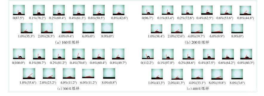 接觸角是指在氣、液、固三相交界處的氣—液界面和固—液界面之間的夾角。接觸角作為測試液體對固體潤濕效果的重要參數(shù),對測試煤塵的潤濕性具有重要作用,接觸角越小,液體對固體的潤濕效果越強(qiáng)。利用接觸角測量儀,對液滴與測試煤樣之間的接觸角進(jìn)行成像,如圖4所示(圖像從左到右,溶液中EMI質(zhì)量分?jǐn)?shù)逐漸增大)。由圖4可知,隨著煤樣粒徑的減小,4種煤樣與液滴之間的接觸角均逐漸增大。當(dāng)加入EMI溶液后,4種煤樣的接觸角隨溶液中EMI質(zhì)量分?jǐn)?shù)增大而變化的趨勢大致相同,均呈現(xiàn)出逐漸減小的趨勢,表面疏水性減弱,煤塵潤濕性增強(qiáng)。