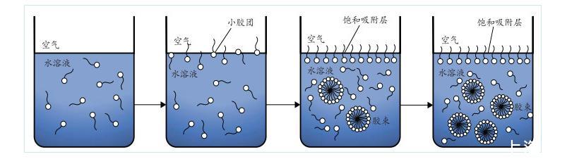 由圖2可知,隨著溶液中EMI質(zhì)量分?jǐn)?shù)的增大,表面張力持續(xù)降低。當(dāng)溶液中EMI質(zhì)量分?jǐn)?shù)大于0.6%后,表面張力的變化趨勢逐漸變緩,幾乎維持在同一水平。出現(xiàn)這種現(xiàn)象的主要原因在于加入溶液中的EMI會(huì)對溶液的表面張力產(chǎn)生重要影響。EMI分子本身具有兩親性質(zhì),其中有機(jī)高分子會(huì)在溶液的表面形成吸附,并在液面定向排列,使疏水基擴(kuò)展于空氣中,親水基則與水面吸附,溶液中EMI分子吸附狀態(tài)隨其質(zhì)量分?jǐn)?shù)變化情況如圖3所示。吸附于水面的EMI分子達(dá)到飽和狀態(tài)時(shí),EMI溶液的膠束質(zhì)量分?jǐn)?shù)便達(dá)到臨界值,EMI分子開始締合逐步形成膠束聚集物,該質(zhì)量分?jǐn)?shù)即為溶液的CMC值。之后,繼續(xù)加入EMI溶液,表面張力不再發(fā)生較大波動(dòng),溶液內(nèi)逐漸締合成更多穩(wěn)定的膠束。