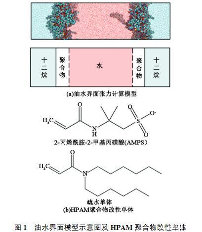 早期的聚合物驅主要采用部分水解聚丙烯酰胺(HPAM),具有界面活性低、耐溫/耐鹽性差等缺點。通過對HPAM進行改性,不僅能改善驅替液的流變性能,還能提高HPAM的界面活性,促進HPAM在油水界面的吸附,以降低油水界面張力,起到乳化原油的作用。目前主要通過試驗手段考察原油乳化行為,使用傅里葉紅外光譜、核磁共振等儀器可表征聚合物或表面活性劑的構象;利用電鏡可觀察乳狀液的形貌和尺寸;通過界面張力測量可評價聚合物、表面活性劑等的界面活性。分子動力學(MD)模擬是基于統計物理原理,將原子、分子的運動與體系宏觀性質建立關系的一種計算模擬方法。Du等對3種聚合物驅油劑進行MD模擬,比較不同溶液的黏度,揭示鹽離子誘導聚合物聚集的機制。Abdel-Azeim等利用MD模擬研究HPAM聚合物和磺化HPAM的締合行為,發現磺化基團與陽離子的相互作用較弱,鹽離子的存在會促進聚合物的締合。Kshitij等使用MD模擬計算熔融聚甲基丙烯酸甲酯的表面張力,其隨溫度變化的結果與試驗測試結果相符。界面處的張力主要來源于界面處原子受到垂直于界面的應力不均衡,從而引起界面處產生平行于界面的張力。筆者對親水性的HPAM進行改性,通過接枝疏水基團增強聚合物與油相的相互作用,減弱油水界面處分子受力的不均衡,通過降低油水界面張力從而獲得高的界面活性。進一步通過接枝具有耐鹽性的磺酸基團,以提升聚合物在高礦化度儲層中的性能。