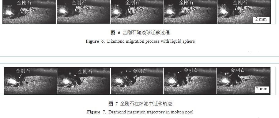 圖8為金剛石置于釬料底部時,金剛石在激光釬涂過程中運動軌跡。可見,無論金剛石是直接鋪置于釬料表面,還是置于釬料底部,在釬涂過程中,金剛石均會上浮到涂層表層。具體過程為在激光熱源作用下,表層的釬料開始熔化成液態小球,由于金剛石的高透光性和高熔點,金剛石不會熔化。在液態小球聚集長大的過程中,金剛石沿著液球邊緣運動,當液態小球匯入大熔球時,金剛石繼續沿著大熔球的邊緣向表面運動,最后凝固于釬料涂層表層。