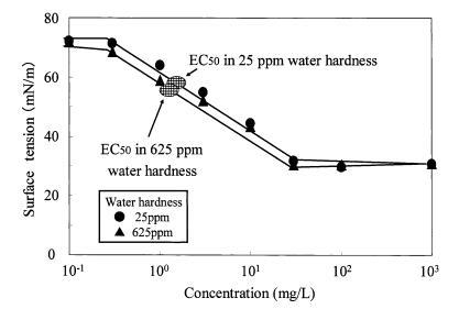 圖 10 水硬度對(duì)表面張力的影響 AE 和有毒表面張力值的曲線 水蚤麥格納。