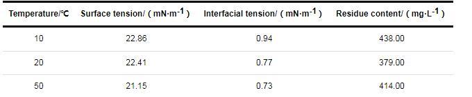 在水力壓裂過程中,僅壓裂返排液的粘度低不能說明裂縫中的壓裂液已返排干凈,要綜合考慮其破膠性能。壓裂液在10、20和50℃條件下破膠3 h后,破膠液的表面張力、界面張力和殘渣量的測定結果如表3所示。由表中數據可知,無論是在10、20還是50℃條件下,破膠液的表面張力均小于28 mN/m,界面張力均小于2 mN/m,殘渣量均小于600 mg/L,達到或優于我國石油天然氣行業標準SY/T 6376-2008《壓裂液通用技術條件》的要求,SY/T 6376-2008中關于破膠性能的各項指標分別為:破膠時間≤720 min,破膠液表觀粘度≤5.0 mPa·s,破膠液表面張力≤28.0 mN/m,破膠液與煤油界面張力≤2.0 mN/m,殘渣量≤600 mg/L。這充分說明ME-O5在低溫下的破膠效果良好,在低溫油田壓裂破膠方面表現出巨大的應用潛力。