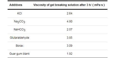 水基壓裂液是由多種不同的添加劑按比例配成的非均質不穩定化學體系。隨著壓裂技術的不斷發展,壓裂液體系也在不斷優化。在實際的壓裂施工中,水基壓裂液的配方由于施工環境的不同,存在著較大的差異。本壓裂液配方選擇油田中常用的瓜爾膠作為稠化劑;選擇硼砂作為交聯劑;為了穩定粘土礦物,選擇KCl作為粘土穩定劑,以減少粘土礦物等對儲層滲透率造成的傷害;為了使壓裂液的性能更加穩定,便于控制,還加入了一定量的Na2CO3和NaHCO3,作為pH調節劑。此外,從低成本的角度考慮,選擇戊二醛為殺菌劑,用來防止細菌滋生。