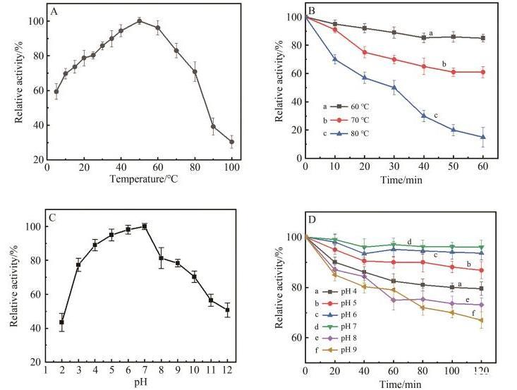 圖5溫度、pH值對β-甘露聚糖酶酶活力及穩定性的影響