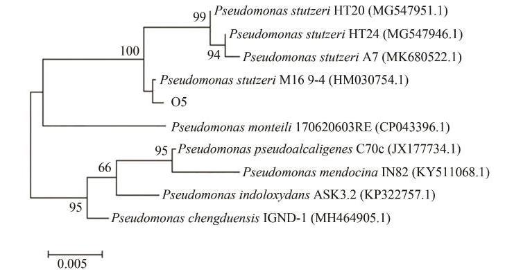 利用16S rRNA基因測序對菌株O5進行鑒定,將測序結果通過NCBI數據庫中的BLAST進行比對分析,發現菌株O5與假單胞菌的同源性最高,為99.87%。利用MEGA軟件構建系統發育樹(圖4)。由圖4可知,菌株O5和施氏假單胞菌Pseudomonas stutzeri M16-9-4位于進化樹的同一分支中,親緣關系最相近。綜合形態特征鑒定,鑒定菌株O5為施氏假單胞菌(Pseudomonas stutzeri),命名為Pseudomonas stutzeri O5。