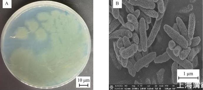 形態學鑒定如圖3所示,菌株O5在LB平板上呈灰綠色,表面光滑隆起,邊緣不整齊;革蘭氏染色鑒定為陰性;經掃描電子顯微鏡觀察得,菌株O5為桿狀菌,菌體長為1.5~2.0μm,寬為0.3~0.4μm。