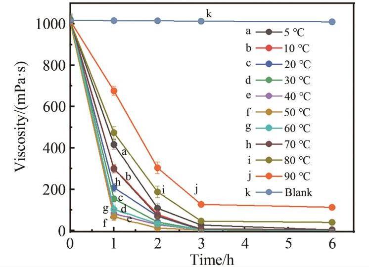 按照配方配置壓裂液,壓裂液凍膠初始粘度為大于1000 mPa·s,加入1%(體積分數)的ME-O5,在不同溫度下分別恒溫反應3和6 h后測得其破膠液的粘度如圖7所示。破膠3 h時,在10~60℃范圍內,ME-O5均可將壓裂液粘度降至5 mPa·s以下,徹底破膠(室溫測定破膠液粘度低于5 mPa·s時視為徹底破膠);但當溫度在10℃以下或60℃以上時,酶的活性受到了影響,未能在3 h內破膠。當破膠時間延長到6 h時,在5~70℃內,壓裂液能徹底破膠。由此表明ME-O5的在中低溫范圍內破膠效果好,在很大程度上彌補了化學破膠劑的破膠效果在低溫時受到限制的問題。