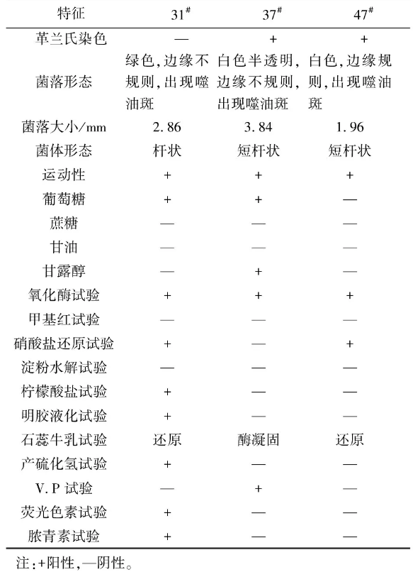 對篩選所得菌株進行常規生理生化特性實驗,結果如表2所示。根據表2所示結果和《伯杰氏(Berge)菌種鑒定手冊》的描述,可鑒定菌株31#為假單孢屬,菌株37#、47#均為芽孢桿菌屬。