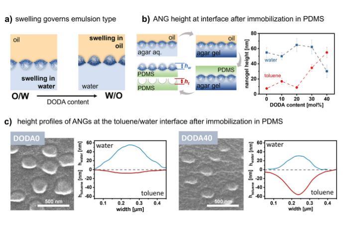 圖1展示了制備兩親性納米凝膠(ANG)的合成方案,以及不同ANG的性質。通過在反應性前體顆粒上功能化混合親水(HPA)和親油(DODA)胺,制備了具有不同網絡疏水性的ANG(圖1a)。動態光散射(DLS)數據顯示了不同ANG的流體動力學直徑,證明ANG保持了相似的膠體性質(圖1b)。非交聯DODA0至DODA40聚合物膜的接觸角表明,ANG的疏水性隨著DODA含量的增加而增加(圖1d)。綜上所述,圖1展示了通過后功能化反應,成功制備了具有可調網絡疏水性但保持相似膠體性質的兩親性納米凝膠庫,為系統研究網絡疏水性對乳液穩定性的影響提供了基礎。