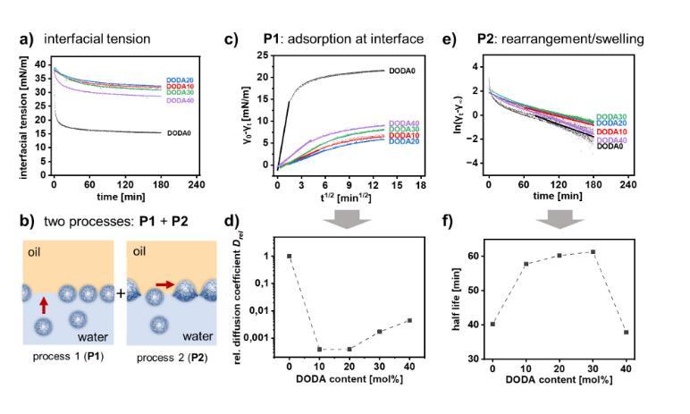 圖3展示了不同疏水性納米凝膠(ANGs)在甲苯/水界面張力(IFT)方面的研究結果。隨著ANGs的疏水性增加,甲苯/水界面張力隨時間非線性降低,但不同ANGs的降低速率不同(圖3a)。IFT的降低分為兩個階段:初始快速降低(P1)和隨后緩慢松弛到平衡狀態(P2)(圖3b)。通過分析P1階段,可以得到描述ANGs界面吸附速率的擴散系數D(圖3c)。不同ANGs的相對擴散系數Drel(相對于DODA0)與ANGs的DODA含量相關:親水的DODA0和疏水的DODA40顯示出最快的界面吸附速率(圖3d)。通過分析P2階段,可以得到描述ANGs重新排列速率的半衰期(圖3e)。半衰期與ANGs的DODA含量相關:親水的DODA0和疏水的DODA40顯示出最快的重新排列速率(圖3f)。