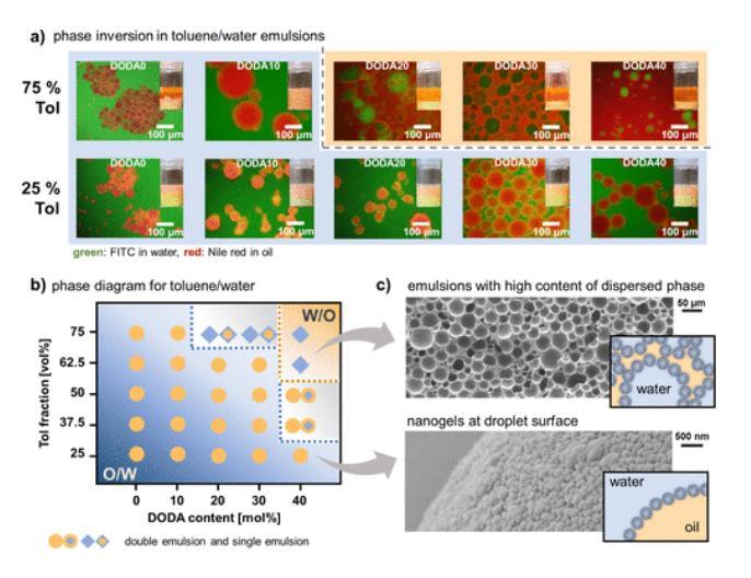 圖2展示了使用不同親水性納米凝膠(DODA含量)制備的甲苯/水Pickering乳液的類型。具體來說,圖2a通過熒光顯微鏡圖像和照片顯示了不同DODA含量下的甲苯/水乳液,其中25 vol%的甲苯觀察到O/W乳液,而在75 vol%的甲苯中,從DODA10到DODA20觀察到從O/W到W/O的相變。圖2b總結了甲苯/水乳液系統中乳液類型對納米凝膠的DODA含量和乳液的油相體積分數的依賴性。圖2c通過SEM圖像展示了高分散相含量(DODA40,Tol-75)乳液和納米凝膠(DODA20,Tol-25)在粒子/液滴表面的存在。