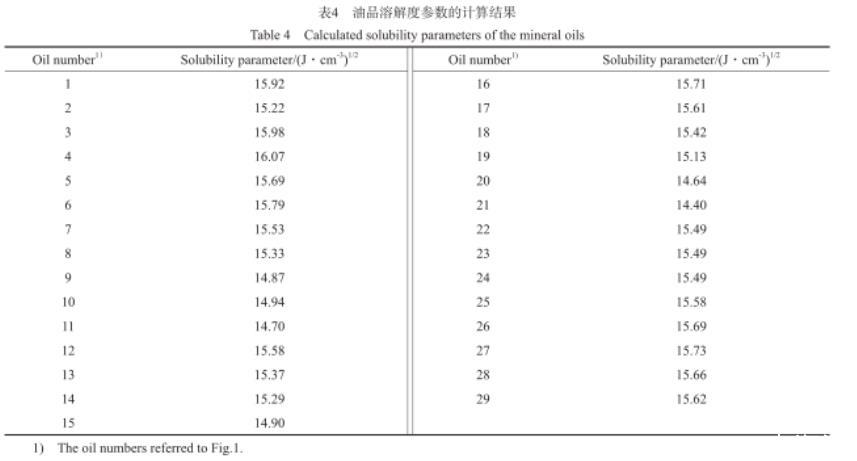 表4油品溶解度參數的計算結果