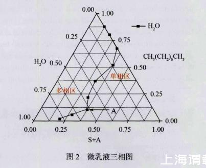 室內(nèi)研究中選用表面活性劑和助表面活性劑組合(S+A)為Tween 80、十八烷基二甲基溴化銨和正丁醇,油相為正辛烷,乳化溫度設為75℃時,制備WinsorⅣ型單相納米乳液;其中,S+A與油相正辛烷按9∶1、8∶2、7∶3、6∶4、5∶5、4∶6、3∶7、2∶8和1∶9依次混合,然后逐滴加入蒸餾水,觀察加入蒸餾水后乳液的澄清渾濁現(xiàn)象來確定H2O/(S+A)/正辛烷體系單相微乳液的微觀結(jié)構(gòu)類型,得到的相圖如圖2所示。選取三相圖中A點的微乳液用蒸餾水定容稀釋并以60 Hz頻率超聲波震蕩5 min后,制得納米乳液NR-A。