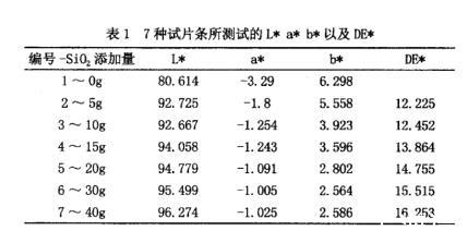 由表1可以看出,選擇沒用添加二氧化鈦的高溫尼龍HTN即1~0g做為標準樣,并測試其L*,a*,b*數值,2~5g,3~10g,4~15g,5~20g,6~30g,7~40g做為比較樣。從數據上進行比較,隨著添加量的增加,2號~7號色差DE*逐漸增加,即試樣表現得越來越白,2號~3號添加量增加5g,雖然L*值變化不明顯,但是b*值變化還是蠻大的,此比例不能說明添加量已經達到飽和狀態。4號~5號添加量增加5g,L*數值變化0.7,5號~6號隨著添加量繼續增加10g,L*數值只變化0.7,說明隨著二氧化鈦添加量的增加,體系所表現的顏色趨于飽和。