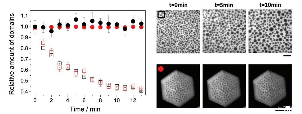 圖 5 帶電(圓形)和中性(方形)雙層(紅色)或單層(黑色)的域相對數(shù)量與時間的關(guān)系。 這些圖像是一個例子 中性單層(上)和帶電(下)雙層在指定時間。 圖像中包含的符號對應(yīng)于圖像中的相同符號 形象的。 比例尺對應(yīng)于 50 毫米。