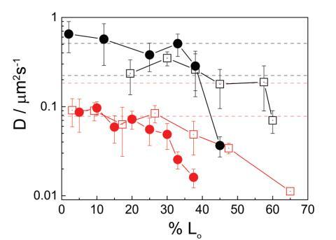圖 2 擴(kuò)散系數(shù)(D)的實驗值 小域 (1–3 mm) 作為面積百分比的函數(shù) 由液體有序相。 正方形代表中性系統(tǒng)和 環(huán)繞帶電系統(tǒng)。 黑色符號對應(yīng) 氣水界面處的單層和雙層的紅色符號。 虛線對應(yīng)于計算的 Dt 值的范圍 域大小的范圍,使用方程 (2) 或 (3)。 實線只是畫的 引導(dǎo)眼睛。