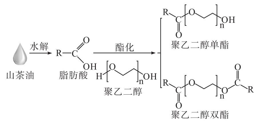 為了解決上述問(wèn)題,本文以聚乙二醇600(PEG600)和山茶油水解產(chǎn)物為原料,通過(guò)水解-酯化兩步法制備改性山茶油,并對(duì)其各項(xiàng)性能指標(biāo)進(jìn)行評(píng)價(jià),為山茶油在水劑型化妝品中的應(yīng)用提供數(shù)據(jù)支持。改性山茶油的制備原理如圖1所示。