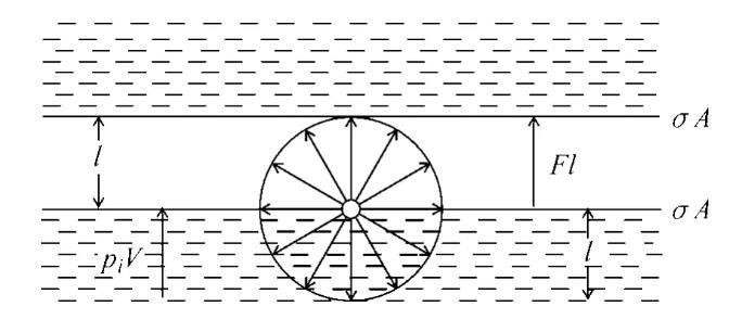 圖3只表示了氣/液表面上一個分子的有效作用范圍,它是一個半徑為l的圓球。圖中piV是體積為V的液體從體相反抗內壓力移至表面時需做的可逆功;Fl是將液體拉開而分成兩半需做的可逆功,即上面所述的內聚功WC。不難證明,這兩個可逆功是等價的,因為如式(4)所示,pi=F/A,而V=Al,其中V是體相中高度為l的液柱體積,A是液柱的橫截面積,所以有: