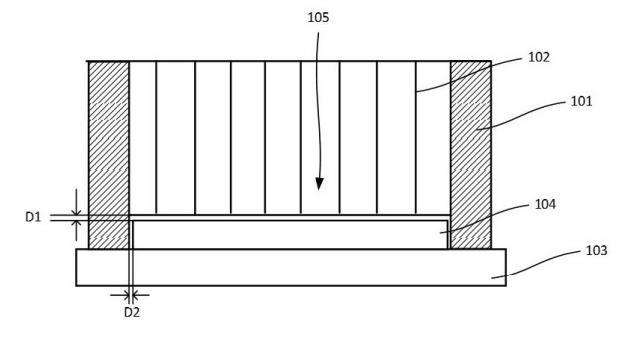 如圖1所示,在一個(gè)實(shí)施例中,所述筒壁101與所述隔離網(wǎng)壁102的高度差為晶圓104高度加上5微米~500微米之和。當(dāng)所述筒壁101被真空吸附臺(tái)103固定時(shí),所述隔離網(wǎng)壁102與所述晶圓104表面的非接觸氣隙的間距D1為5微米~500微米,本發(fā)明的非接觸氣隙被配置為當(dāng)腐蝕液進(jìn)入某一個(gè)腐蝕區(qū)域105時(shí),基于液體表面張力使得腐蝕液不會(huì)進(jìn)入到相鄰的腐蝕區(qū)域105,可以避免隔離網(wǎng)壁102對晶圓104造成損傷,大大提高工藝穩(wěn)定性,同時(shí),可以消除因晶圓104表面不平整導(dǎo)致的直接接觸造成高度差異而產(chǎn)生有的部分直接接觸的情況。
