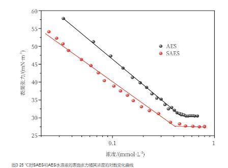 圖3 25℃時SAES和AES水溶液的表面張力隨其濃度的對數變化曲線