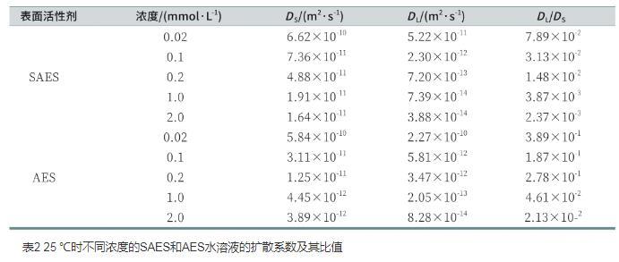 表2 25℃時不同濃度的SAES和AES水溶液的擴散系數及其比值