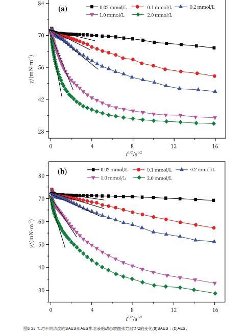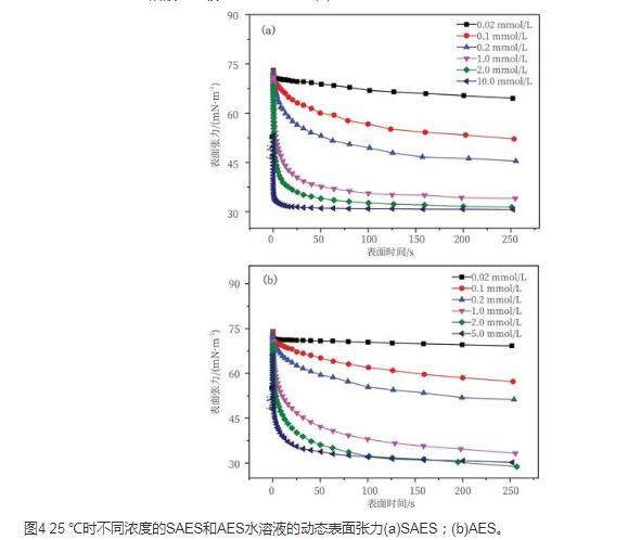 從圖4可以看出所測不同濃度不同表面活性劑的表面張力在初始階段均快速下降,一定時間后趨于平穩狀態。這是因為動態表面張力測試過程中新形成的表面遠偏離于平衡態,吸附層離子的濃度很低,體相與吸附層的濃度差大,因此動態表面張力變化很大。隨著吸附的進行,次表面濃度和表面濃度逐漸增大,擴散和吸附的速度均逐漸降低,動態表面張力隨著吸附時間的增加而降低的趨勢也逐漸變得平緩。當表面活性劑濃度增大時,表面張力的下降幅度和速度也隨之增大,而且相應地縮短了到達平衡狀態的時間。這種隨體系濃度的增加達到平衡所需的時間越短的趨勢與已經報道的一些烷基表面活性劑的結果是相一致的。在相同濃度下,SAES表面張力下降的速率大于AES,這是由于SO4-在碳氫鏈中間的化合物比在端點者擴散速度快。
