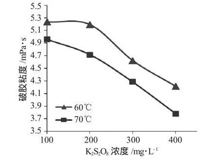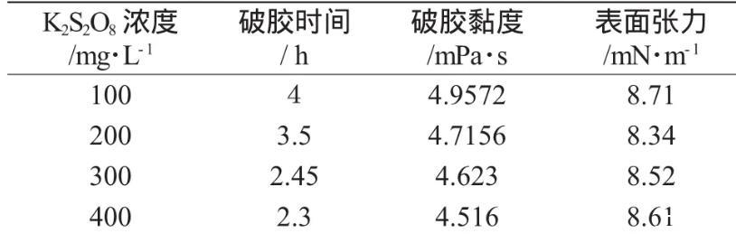 表2結果表明,溫度為70℃時,隨著破膠時間增加,K2S2O8作為破膠劑的破膠液破膠粘度和表面張力是逐漸降低,當K2S2O8加入量為100mg·L-1時,4h后破膠液粘度為4.9572mPa·s、8.71mN·m-1,當K2S2O8加入量為400mg·L-1,2.3h破膠后破膠液粘度為4.516mPa·s、8.61mN·m-1。