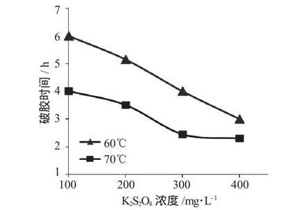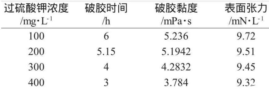 (1)在實驗溫度60℃下,通過對比過硫酸鹽濃度不同,濃度越高,破膠時間縮短,破膠液粘度和表面張力逐漸降低。