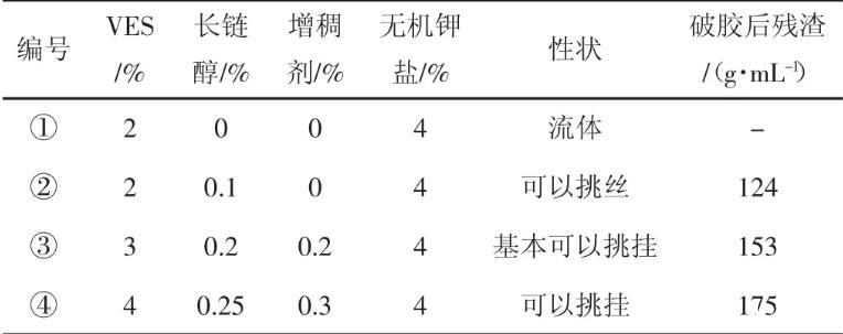 由表1可知④號(hào)配方當(dāng)VES的含量為4%,長(zhǎng)鏈醇為0.25%,無(wú)機(jī)鉀鹽含量為4%,增稠劑含量為0.3%時(shí)可以挑掛且殘?jiān)可伲瑸樽罴训呐浔取L鸩藟A型陽(yáng)離子清潔壓裂液的配方(見表2)。