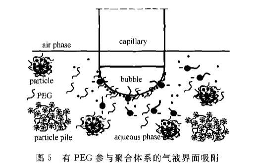 由圖3可見,有PEG參與的聚合體系。5rain的DST與圖2相比變化起伏較大,有先低后急升再緩降的變化模式,與一般的DST呈單調減小的趨勢有很大不同。這是因為在反應剛開始體系中除了單體、齊聚物和膠粒,又增加了PEG,而且PEG與齊聚物、膠粒作用形成粒子堆口]。PEG是完全水溶性物質,在體系水相中的濃度遠遠大于單體和齊聚物,但擴散速率要小于單體及齊聚物,因此一開始部分新形成的氣液界面會由擴散速率最快的單體迅速占領,而隨時間推移PEG借助濃度優勢會替代單體占據氣液界面,如圖5所示,最終達到平衡,由單體、齊聚物和PEG共同覆蓋整個氣液界面。PEG水溶液的氣液界面張力要比單體的氣液界面張力大得多,因此在水相中有大量單體存在的情況下,此聚合體系的DST會出現先低后急升的曲線形狀。這個狀況會一直持續到30rain時,可以看出,PEG使體系直到30min時仍有大量游離單體存在于水相,而無PEG參與的體系此時已無單體游離在水相中。這一點可以從圖6轉化率一時間曲線得到證實,無PEG參與的體系30min時已接近聚合終點,而有PEG參與的體系轉化率才只有25左右。待反應至50min時,DST趨勢平穩,水相中游離的單體已經很少,此時轉化率在49左右,說明單體已基本進入到膠粒中。這個狀態一直維持到60min時。75min時的體系有很大變化,從宏觀看粒徑發生轉變,由大變小。從DST曲線看氣液界面張力明顯提高,轉化率已快速增加到95,接近終點。此時體系中對DST的貢獻主要以脫離粒子堆的成熟粒子l3和PEG為主。