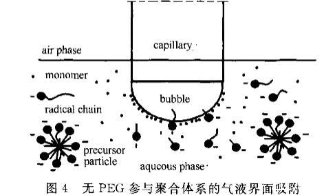 由圖2可見,無PEG參與的聚合體系中,隨聚合進行,體系所表現的氣液界面張力趨勢為逐漸增大,從5min的28mN·m~左右到6Omin的60~65ITIN·m~,75min則稍有回落,在55~61mN·m。各時間段的DST趨勢較為平穩。這種氣液界面張力隨聚合進行逐漸上升的趨勢較為符合無皂乳液聚合反應機理。在反應初期水相中不僅有溶解在水中的單體,還有引發形成的齊聚物,這種齊聚物一端帶有疏水鏈段,另一端帶有親水性的一SO引發劑碎片,具有表面活性。當齊聚物達到膠束濃度時會聚并成基本粒子,由幾十個到上百個齊聚物組成。溶解在水相中的單體分子量相對齊聚物小很多,體積小,擴散速率快,極易遷移至氣液界面。對于一開始的反應,體系中仍有大量單體存在,水相中的單體濃度基本保持在飽和狀態,因此大部分氣液界面首先由單體等物質占據,還有極少部分的界面由具有表面活性的齊聚物覆蓋,如圖4所示。所以與圖1對比會發現,5min時的氣液界面張力非常接近單體本身的氣液界面張力。隨聚合進行,水相中的單體逐漸耗光,氣液界面張力開始逐漸上升,此時到達氣液界面的則主要是齊聚物和膠粒,相對單體的遷移速率要慢很多,因此10min以后的DST衰減斜率要大于5rain時的。
