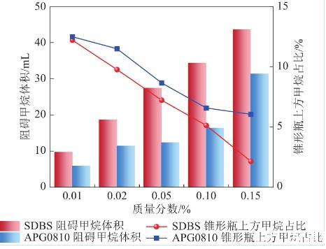 通過式(4)計算得到泡沫中注入氣體含量。圖10中柱狀圖可以看出,SDBS溶液泡沫對甲烷的束縛效果明顯優于APG0810,APG0810溶液由于發泡性及泡沫穩定性均弱于SDBS,故對甲烷束縛能力較差。質量分數為0.05%的SDBS可控制27.43 mL甲烷,0.15%的SDBS可控制43.649 mL甲烷,占總注入甲烷體積87%。質量分數為0.15%的APG0810溶液可控制31.33 mL甲烷,占總注入甲烷體積62.6%。