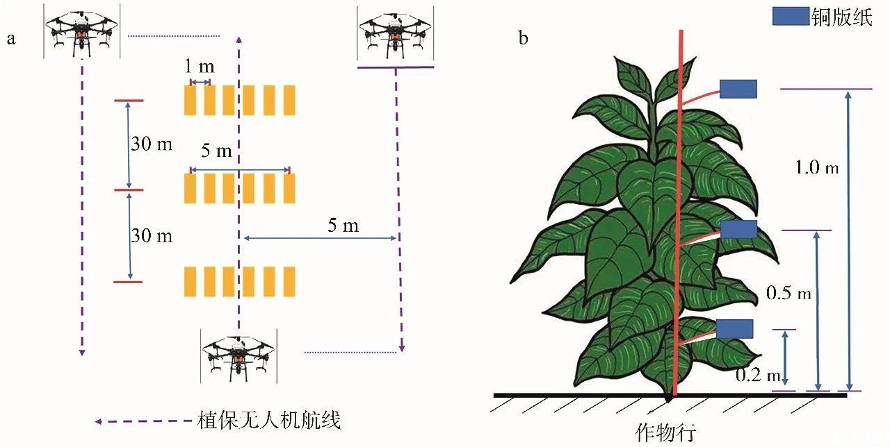 試驗時無人機采用常規(guī)往復施藥模式進行噴霧作業(yè),各條航線之間間隔為5.0 m,試驗地塊開闊無遮擋,且煙草長勢較為一致。試驗前,在各處理小區(qū)中間地帶布置3排間隔為30.0 m的霧滴采集帶,每條霧滴采集帶含6個霧滴采集點,每個采集點間隔1.0 m,總長度5.0 m(圖1a)。每個霧滴采集點處插一根采樣桿,用雙頭夾將銅版紙固定在采樣桿上。設置上、中、下3層采樣位置,分別距地面1.0、0.5和0.2 m(圖1b)。用于測定煙草上、中、下冠層的霧滴密度和覆蓋率。噴霧結(jié)束后,待銅版紙上的霧滴自然晾干后收取并裝入自封袋帶回實驗室。