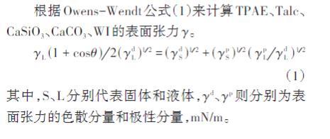 根據(jù)Owens-Wendt公式(1)來(lái)計(jì)算TPAE、Talc、CaSiO3、CaCO3、WI的表面張力γ。