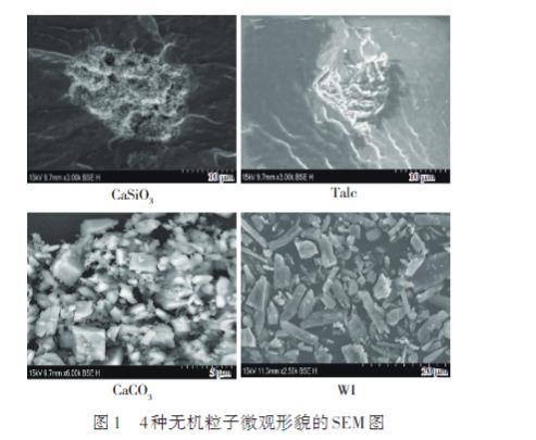 4種無(wú)機(jī)粒子的表觀形貌如圖1所示,可以看出,CaSiO3顆粒為多孔蜂窩狀結(jié)構(gòu),Talc顆粒形狀為偏平形,CaCO3顆粒形狀不規(guī)則,WI多為針狀形顆粒。