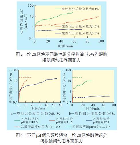 ZhangL等曾對勝利油區孤東油田外輸油中的酸性組分按相對分子質量和極性細分,研究發現:對于相對分子質量較低的脂肪酸,弱堿條件下就能夠發生反應,大幅度降低界面張力瞬時值,但穩態值較高,動態界面張力曲線呈“V”型,油酸模擬油的動態界面張力特性就是典型代表;而對于相對分子質量較高、含稠環的芳香酸,則只能與強堿發生反應,生成的芳香酸皂水溶性較弱,傾向于吸附在界面上,因此,動態界面張力不再出現極小值。坨28區塊原油的酸性組分是混合酸,其中不同結構的石油酸可能在不同pH值條件下分別起主導作用:低質量分數的乙醇胺溶液主要與低相對分子質量的脂肪酸作用,而高質量分數的乙醇胺溶液主要與高相對分子質量的芳香酸作用。